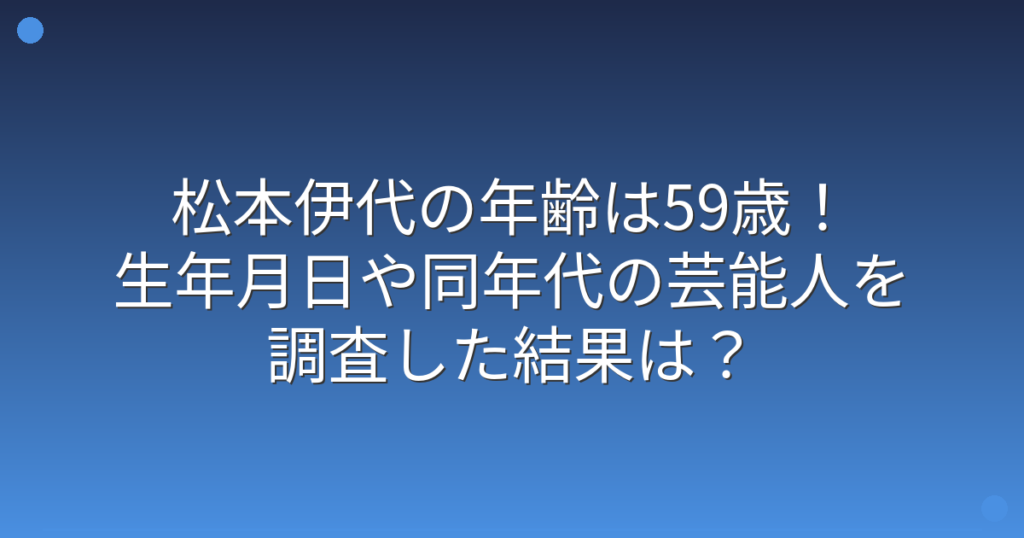 80年代のアイドルとして活躍し、現在もバラエティ番組などで活躍している松本伊代さん。 いつまでも若々しい松本伊代さんですが、実際の年齢はいくつなのか気になりますよね。 そこで今回は、松本伊代さんの年齢や生年月日、同年代の芸能人について詳しく... -