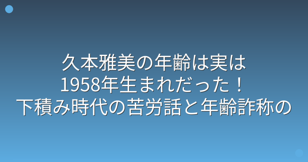 芸能界のベテラン女優として活躍する久本雅美さんの年齢について、最近また注目が集まっています。 実は久本雅美さんには年齢詐称の過去があり、長年公表していた年齢と実際の年齢には差があったことが明らかになっています。 そこで今回は、久本雅美さん... -