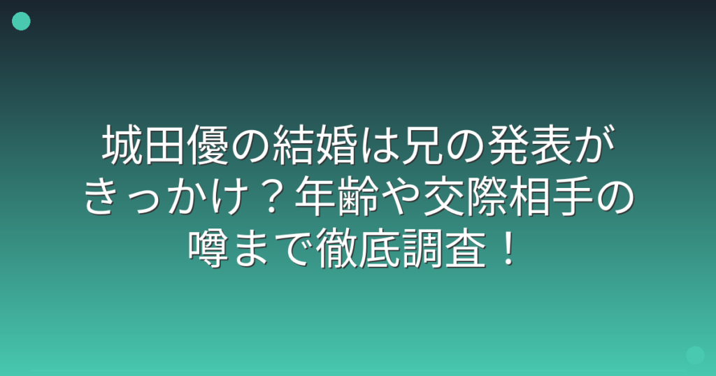 城田優さんの結婚について、大きな注目が集まっていますね。 特に兄の城田純さんが2025年9月に結婚を発表したことで、城田優さんの結婚についても期待が高まっています。 そこで今回は、城田優さんの結婚に関する最新情報や、年齢、交際相手の噂について詳...