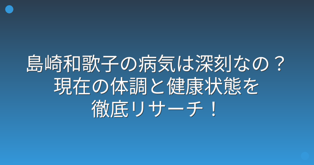 近年、芸能人の健康状態や病気に関する話題が注目を集めていますね。 特に、長年テレビで活躍している島崎和歌子さんの健康状態について、多くのファンが気にかけているようです。 そこで今回は、島崎和歌子さんの病気や現在の体調について、詳しく見てい... -