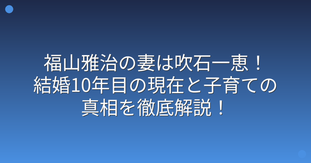福山雅治さんと吹石一恵さんの結婚生活が、2025年で10年目を迎えました。 特に最近では、吹石一恵さんの約9年ぶりとなる女優復帰が大きな話題となっています。 そこで今回は、福山雅治さんの妻・吹石一恵さんについて、結婚生活の現在や子育ての様子まで、... -